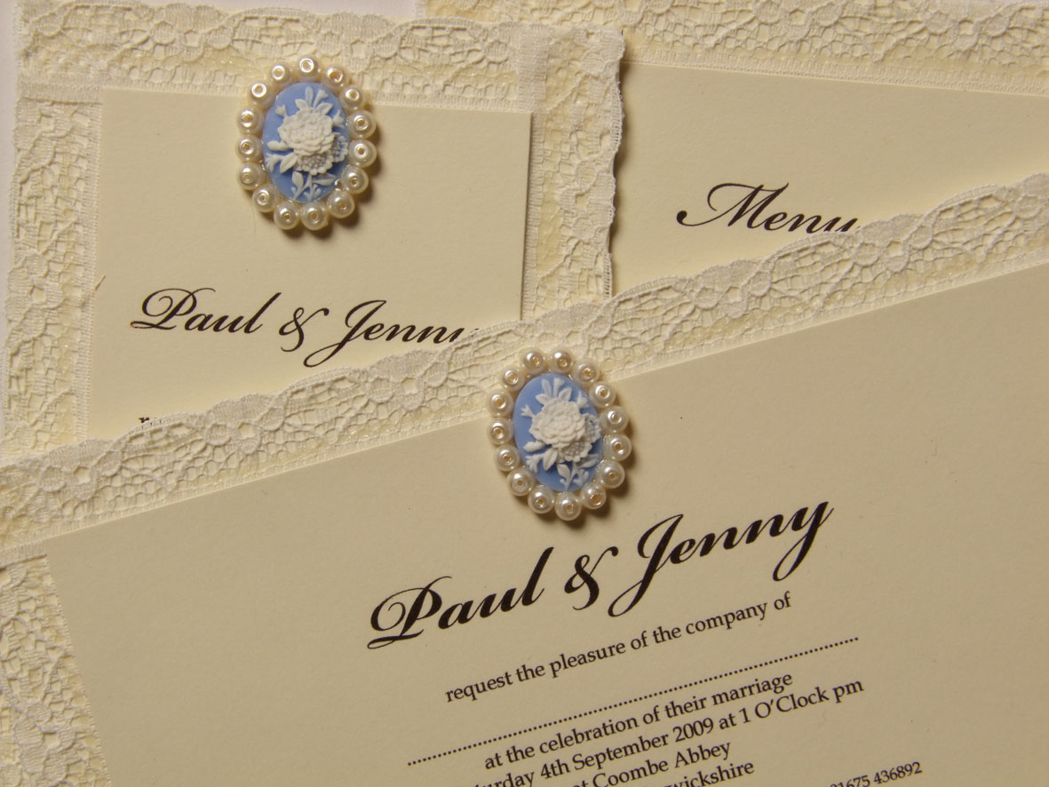 This gorgeous combination of cream and blue can be used in quite a classic modern way .. but I love it with vintage styling, such as 1950's style dresses and birdcage veils, lace trims and boleros and beautiful pearl jewellery. Tables look great laid with fresh blue linen, cream napkins and old vintage glassware ... which can also be used for a fabulous sweet buffet. You can also echo the stationery with beautiful Wedgwood blue cameo necklaces.
